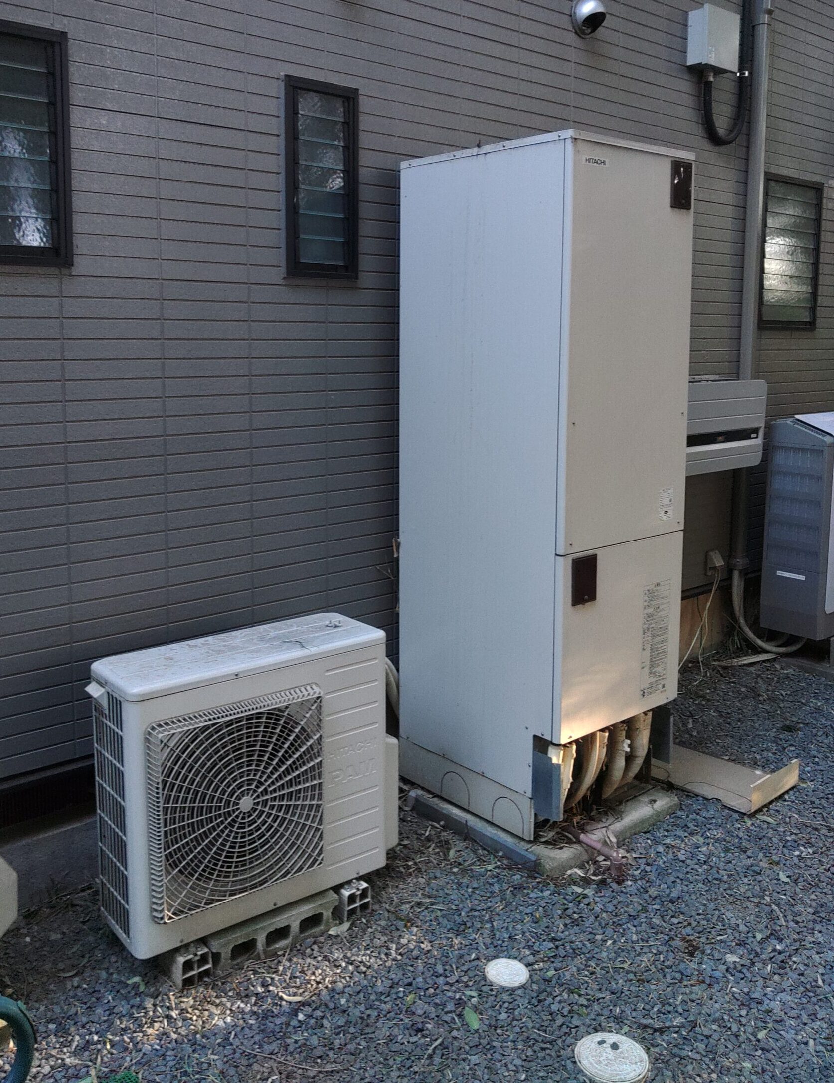交換前のエコキュートです。 経年劣化による不具合で自動湯張りが途中で止まってしまう症状が頻発しており、本体交換のご相談を頂きました。