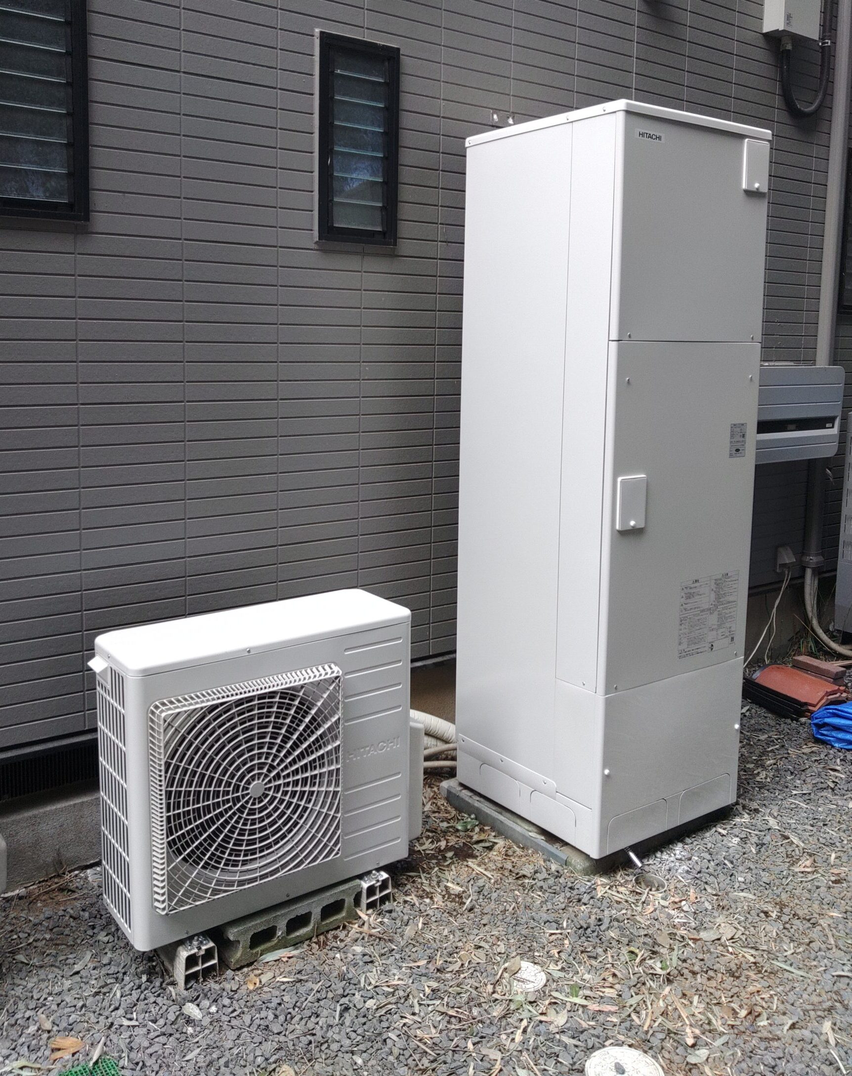 交換後のエコキュートです。 商品は日立:BHP-FG46XU こちらを採用。 施工時間3時間程で完了しました。 これで自動湯張り時の不具合も解消です。 どうもありがとうございました。