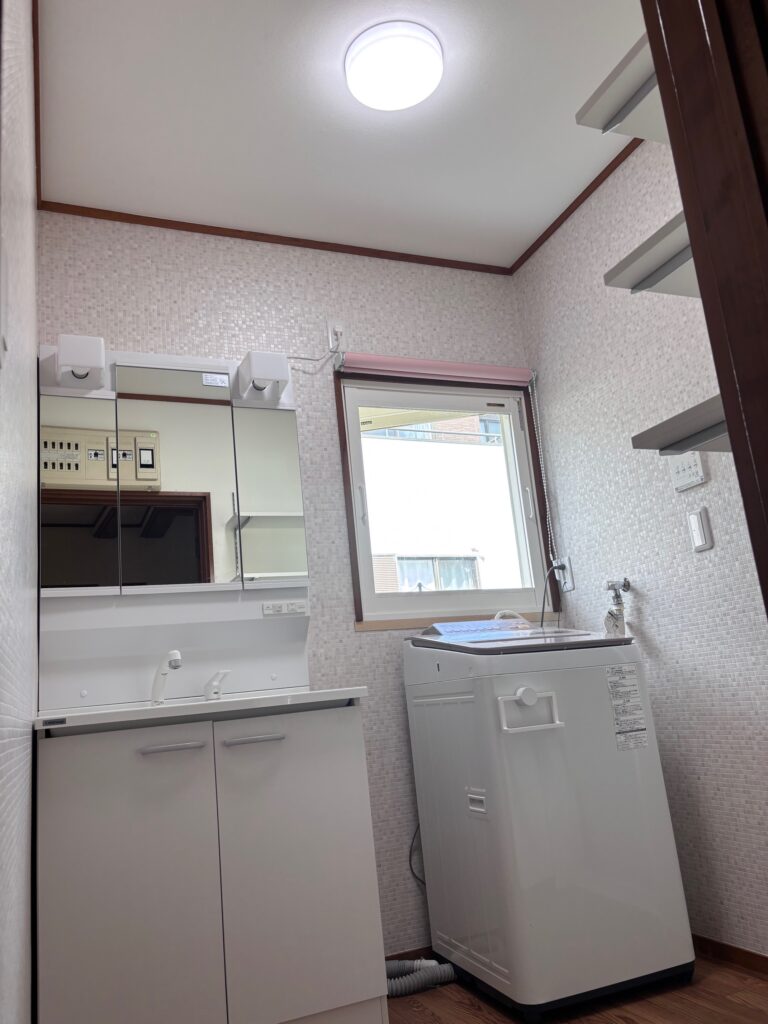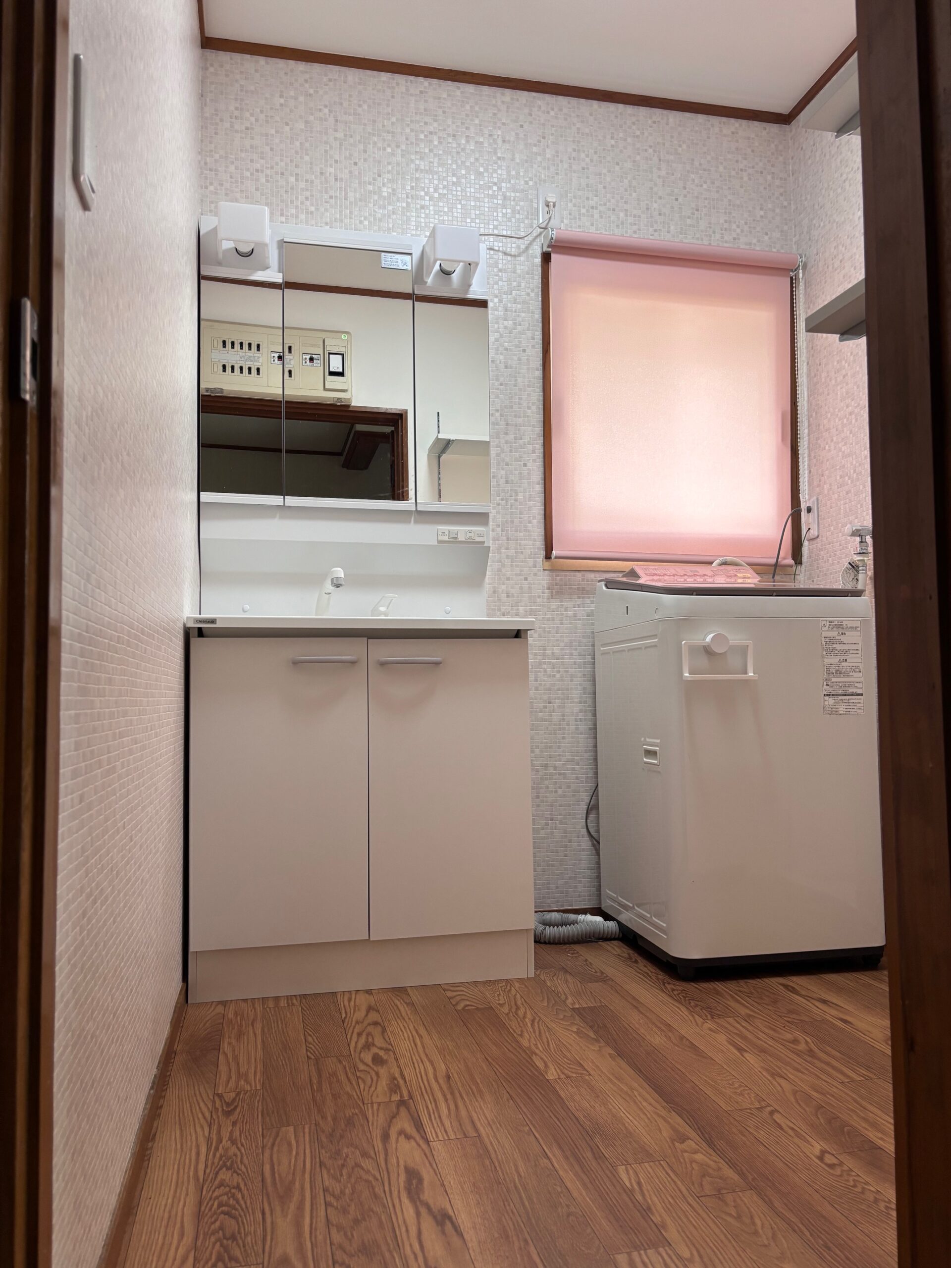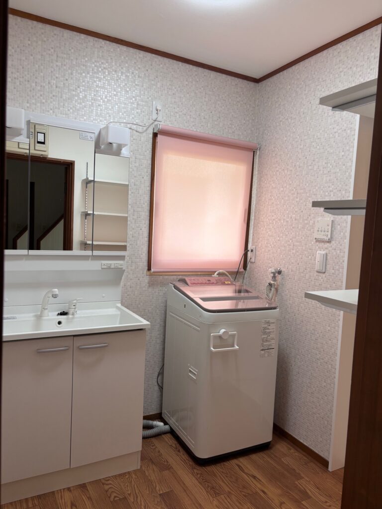 今回は奥様チョイスのクロスが大成功!イメージ変わったね~♪の洗面室をご紹介します!