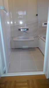 浴室へのアプローチをバリアフリー化、浴槽横へ手すりを設置。